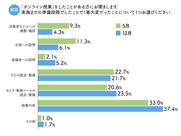 下記の設問のように、オンライン授業実施までに大変だったことが「PCの設定・設備」「カメラ・動画ツールの設定・整備」が多いことからも、教員の負荷軽減は今後念頭に置いていかなければならない。