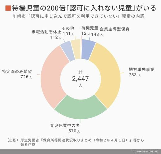 川崎市の「保留児童数」つまり「認可に申し込んで認可を利用できていない児童数」は2447人になりますが、ここから上記6つのケースに当てはまる2435人が差し引かれ、待機児童数は12人と発表されています。