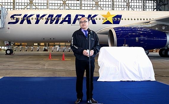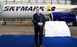 新機材のお披露目会見で、スカイマークの西久保愼一社長は新機材に対する大きな期待を語っていた