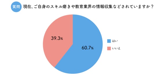 実際、今回の調査では、現場の先生方が新たな取り組みに積極的なのも明らかになった。先生方個人のスキル磨きや教育業界の情報収集の実施の有無を確認した設問では、60.7%が行っていると回答。また今後、外部の研修なども受けるつもりがあるとする回答は、全体の68.5%にのぼった。