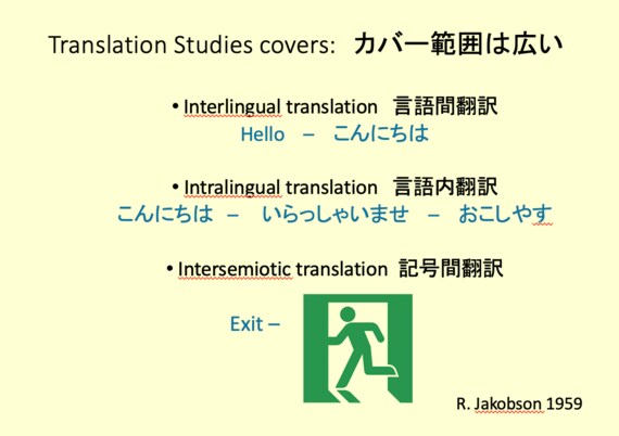 言語を越える「記号間」もあります。非常口は英語で”EXIT”ですが、それをピクトグラムにして表すことがたくさんある。“非常口”や”EXIT”と表記していない場合でも、意味がわかりますよね? こういう関係を「記号間翻訳」と言います。この3つで大概のコミュニケーションはカバーできる。非常に守備範囲の広い学問なんです。