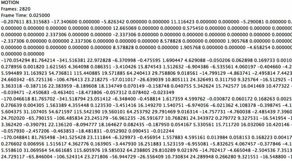 ご覧のとおり、数値の羅列ですね。身体の各部位の位置変化を3次元的に表現しており、1秒を40コマに分けて記述しています。2850コマ分のデータが提供されているので、70秒間のダンスの動きがこれで表現されていることになるのですが、ファイルサイズは約2000KB。英数字が200万ケタ羅列されており、人間が読むのは到底不可能です……。