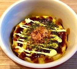2に低糖質お好み焼きソース、低カロリーのマヨネーズ、青のり、かつおぶしをかけて完成