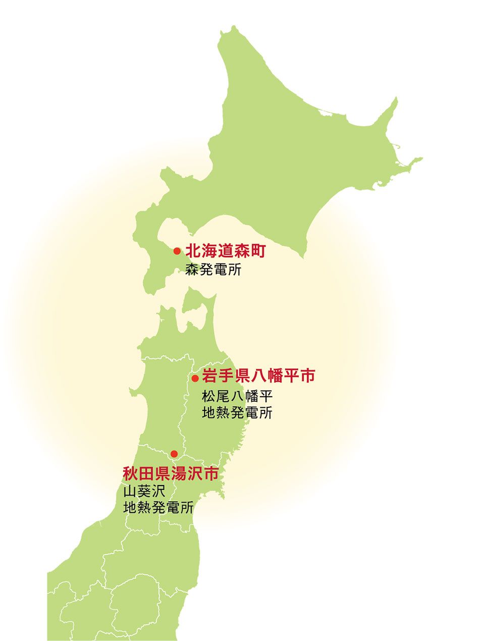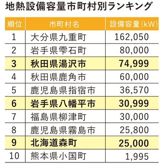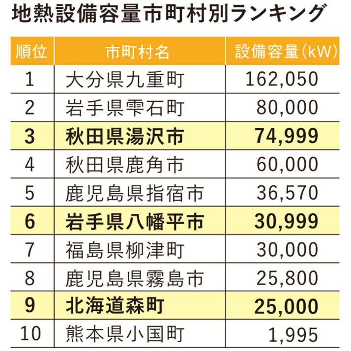 岩手県八幡平市は、66年に日本初の商用地熱発電所である松川地熱発電所が運転を開始し、稼働を続けている。71年に、発電所の蒸気による温水の供給を受けた地元のホテル、八幡平ハイツが成功を収めたことから、ホテルや別荘が相次いで建設され八幡平温泉郷の形成につながった。現在も地熱蒸気の一部を約800軒の施設に供給しているほか、保養所や福祉施設、農業ハウスなどでも熱水が利用されている。