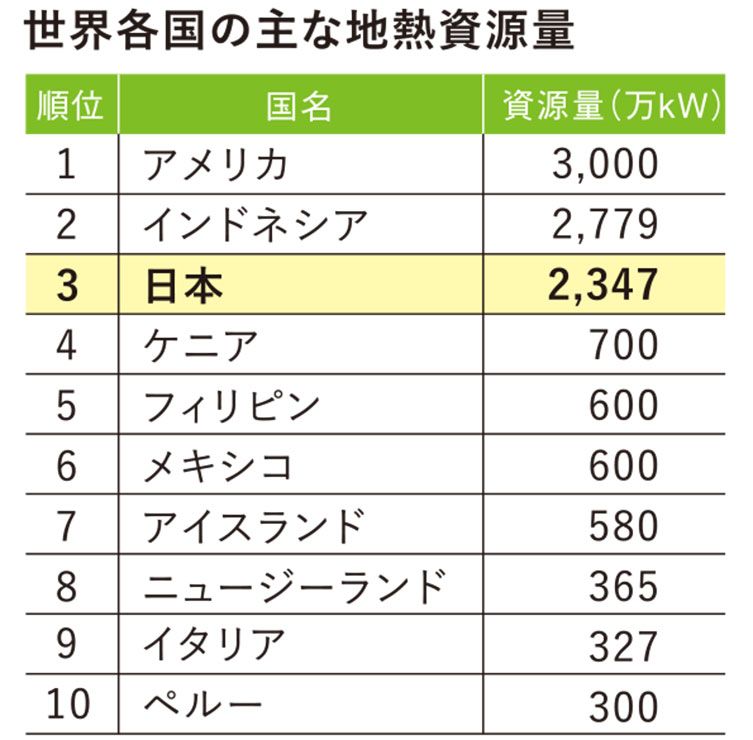 このうち、火山国である日本で高いポテンシャルを秘めているのが地熱だ。資源量を見ると、日本は米国、インドネシアに次いで世界3位の地熱資源国となっている。もちろん、それらすべてを発電などに利用できるということではないが、その活用を推進することには大きな意義がある。