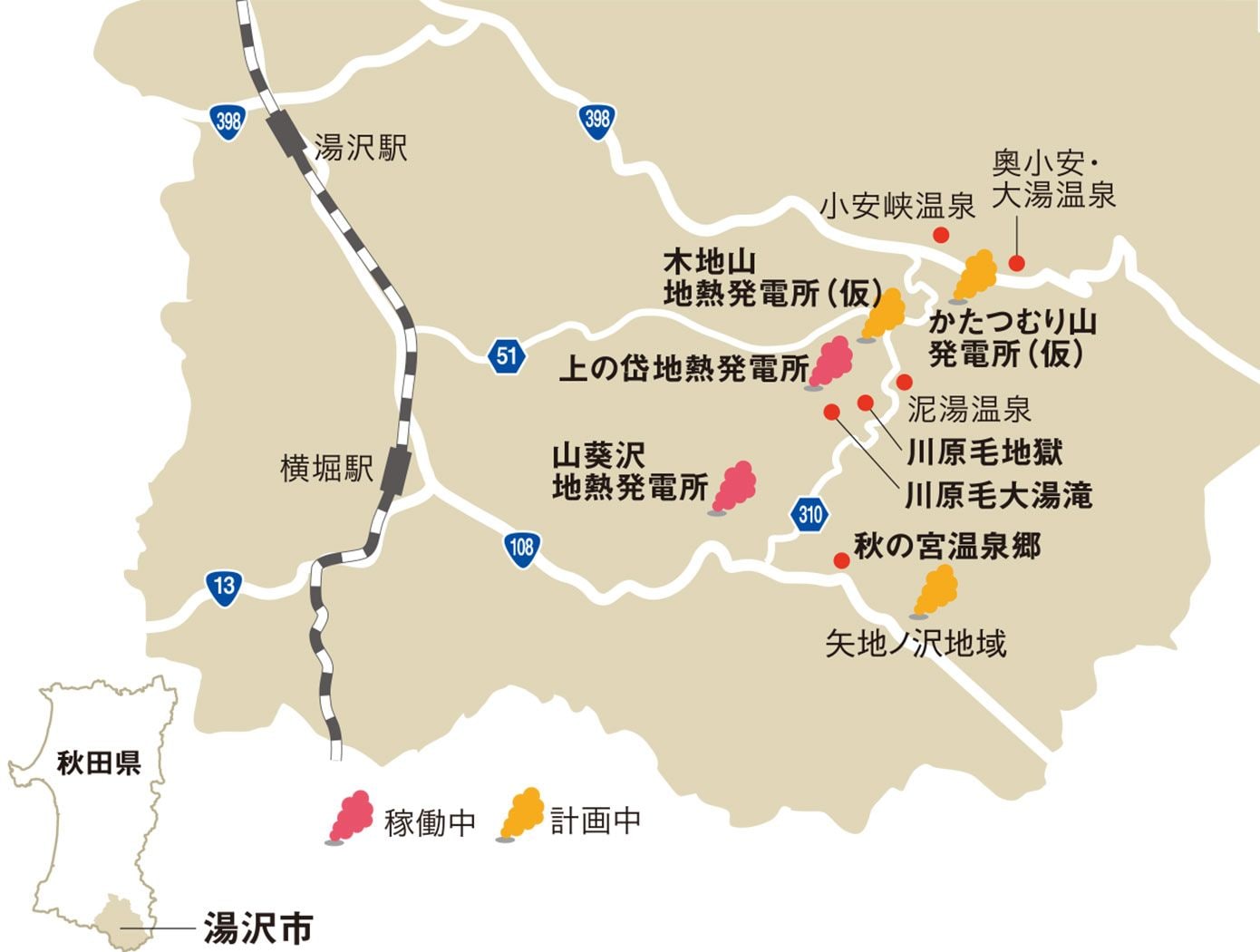 市が位置する西栗駒一帯には小安峡温泉、秋の宮温泉郷、泥湯温泉などが点在し、日本有数の地熱賦存地帯といわれている。その地域資源を活用し、1994年には設備容量2万8800kWの上の岱地熱発電所が運転を開始。2019年には、出力1万kWを超える大規模地熱発電所としては国内で23年ぶりとなる山葵沢地熱発電所(4万6199kW)が運転を開始した。また昨年11月には、