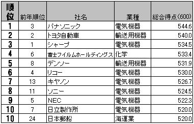 総合トップは544.6点でパナソニックだった。08年6位、09年3位と順調に順位をアップ。「雇用分野得点」8位、「環境分野得点」8位、「企業統治+社会性分野得点」3位、「財務分野得点」14位といずれもトップはないものの、「財務」以外はすべて10位以内。省エネ家電など強みを持つ環境分野に加え、大手メーカーとしては非常に高い女性管理職比率5.7%といった女性の積極的登用などで雇用分野の得点も高かった。