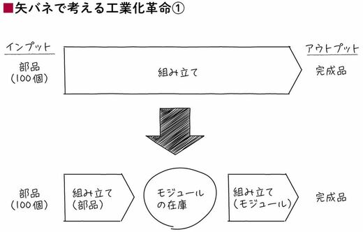 時計や家電などを作るにあたって、インプットするものを「部品100個」としよう。かつては、それを職人がひとつひとつ組み立てる手作業を経て、「完成品」としてアウトプットされていた。