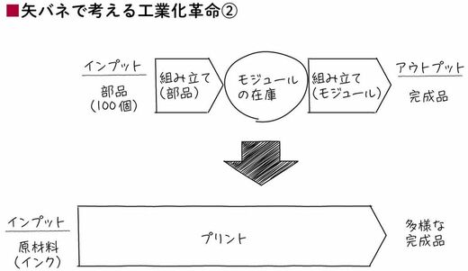 さらに、モジュールごとに作りだめもできるし、分業や外注も可能だという発想も浮かぶ。この「矢バネ」の構造の変化が、20世紀初頭に起きた大量生産の工業化革命なのだ。