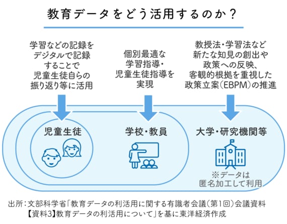一方、教員も子どもたち一人ひとりの学習の進捗状況を詳細に把握できるようになるので、それぞれの児童生徒に応じた最適な指導が可能になる。さらに、児童生徒の学習データを集めてビッグデータとして分析すれば、つまずきやすいポイントを明らかにし、どのような教え方をすれば理解度が高まりやすいのか、といった傾向が見えるようになる。これらの分析結果から、大学や研究機関には、より効果的な指導法を開発することが期待される。文部科学省や教育委員会も、科学的な根拠に基づいて教育施策の立案ができるようになるだろう。
