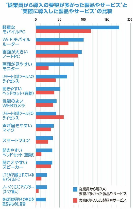 昨年11月、従業員300人以下の企業500社を対象に調査を行いました。在宅勤務に当たり導入したものとして、「軽量なモバイルPC」「画面が大きいノートPC」「ビデオ会議システムのライセンス」が上位に挙がりました。顧客とオンラインでコミュニケーションを取るために、大急ぎで取りあえず最低限の環境が整えられたことがうかがえます。