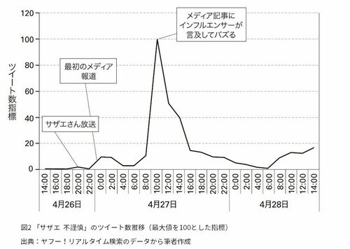 これを見ると、『サザエさん』放送時にはほとんど投稿されていなかった「サザエ 不謹慎」を含むツイートが、最初にメディアで報道されてから急増し、さらにその後インフルエンサーがそれらの記事に言及したことで、瞬く間に広まっていったことがわかる。