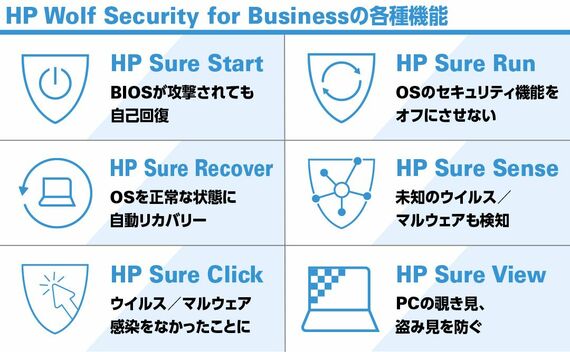 大津山:一言で言えば、いまの時代に即したセキュリティ機能を、PCにあらかじめ組み込んでいます。HPビジネスPCには「HP Wolf Security for Business」と総称している先進的なセキュリティ機能が搭載されています。