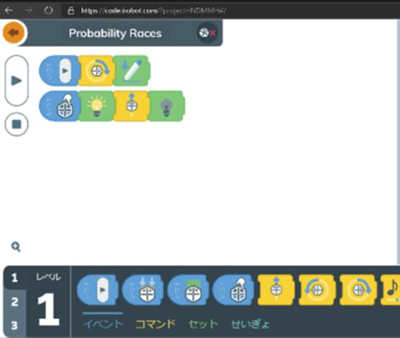 「画面の下にいろいろなブロックがあるよね? 青いブロックからスタートして、指示をしたいときは黄色いブロック。長く押して移動させてつなげてみよう。いろんなマークがあるから、何の指示なのかヒントにして、『Root』くんへの命令をイメージしながらつなげて、どんなふうに動くのか試しながらやってみて。動かすときは、左の矢印マーク。これよく見るよね? 再生とストップボタンだよ」
