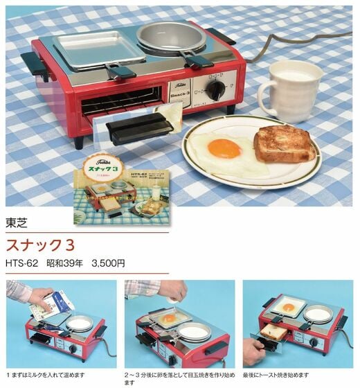慌ただしい朝に、トースト・ホットミルク・目玉焼が一度に調理ができるという「スナック3」。使い方は取扱説明書によると「まずミルクを入れ、2~3分たったら次にプレートに卵を落とし、最後にトースターにパンを入れる」。まさしく同時進行で3品を調理といったところです。