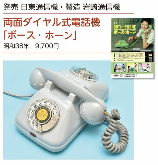 1つの電話機にダイヤルが2つ、机をはさんで両方からダイヤルできるという「ボース・ホーン」。もちろん電話をかけられるのは1回線だけです。当時は電話回線が少なく、また回線を申し込んでも希望者が多く、すぐに引くことができなかったことから、このようなアイデアが生まれました。