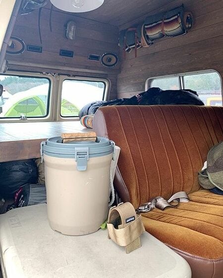 インテリアはルーフとサイドにウッドに貼り、カントリー調にまとめあげた。シートを格納してルーフと同じウッドで作ったパネルを敷けば、そのまま車内で寝ることもできる。