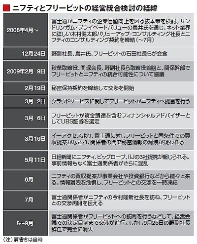 下図と下表は、ニフティとフリービットの経営統合プロジェクトを時系列表に整理したもの。プロジェクトには、富士通でM&Aを推進する事業開発室に加え、ニフティにバックボーン「FENICS」を提供するなど事業上のつながりの深いネットワークサービス事業本部なども参加していた。