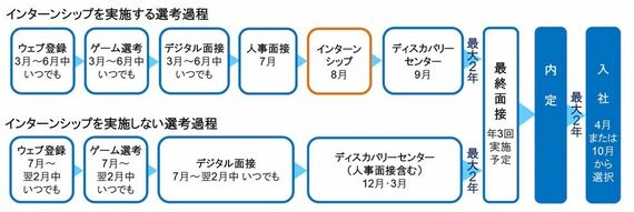 また、一度不採用となっても、1年の期間を置けば何回でも応募することができる。応募者の意志で最終面接や入社のタイミングが選べるという点も大きな特徴。大学生の場合、入社は卒業後となるが、最終面接と入社の前に最大2年の期間を空けることができるので、この期間を活用して大学院への進学や海外留学などをすることも可能だ。