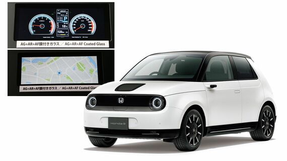 量産車で初めて、インストルメントパネルに5つものスクリーンを水平配置したことで話題となっているホンダe。その車載ディスプレイに使われたのは、重い鉄球などを落としても割れにくい「Dinorex®(以下、ダイノレックス)」と呼ばれる化学強化専用ガラスだ。また、映り込みや光りの反射を防ぐ処理など、ほかにもさまざまな処理が施されているという。