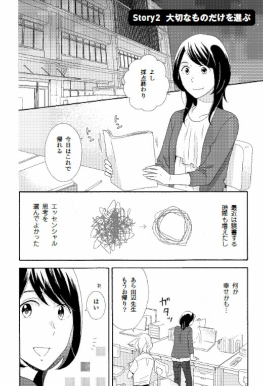 通常業務に加え、数えきれないほどの雑務に追われ、そのうえ人からの頼まれごとなどで多忙を極めていた小学校教師の田辺貴代(26歳)は、元同級生の前沢塁に「エッセンシャル思考」を教えてもらったことで、“本当にやりたいこと”を選択し、少しずつ自分の時間を取り戻していきます。