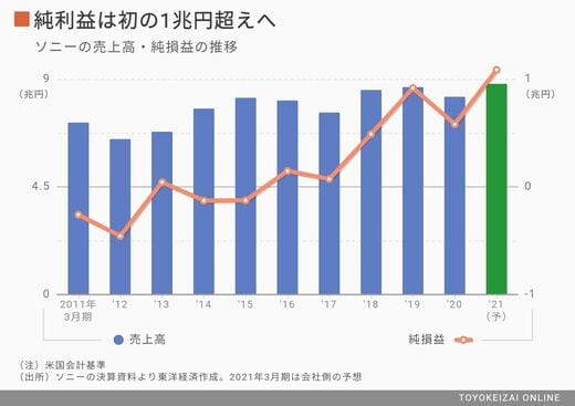 2021年3月期は760万台超、2022年3月期は1480万台超の出荷を計画しているPS5は、世界的な半導体需給の逼迫により、台数を上積みすることは難しい。新作公開ができない映画部門は、2021年3月期こそ制作・広告費減により増益だが、2022年3月期は前年ヒット作不在によるライセンス収入の減少が見込まれる。足元ではこうした不安もあるが、それでも全体としては業績の急降下を示唆する兆候は見られない。