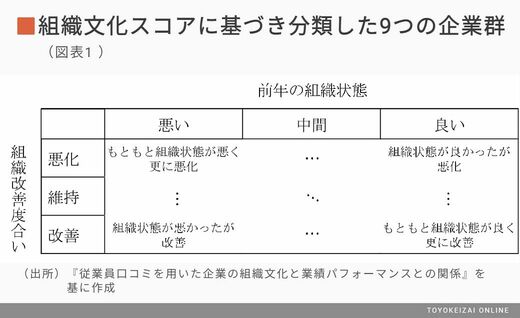 それぞれの財務指標と、下記の表にあらわす9分位ポートフォリオに分けられた企業群との相関関係を調べた。まず算出した組織文化スコアをベースに対象企業の前年の組織状態を「悪い」「中間」「良い」の3段階に分類し、さらに翌年の組織文化スコアの改善度合いで「悪化」「維持」「改善」3段階に分類、計3段階✕3段階の9種類に企業を分類したうえで、それぞれの財務指標との関連性を調査した。