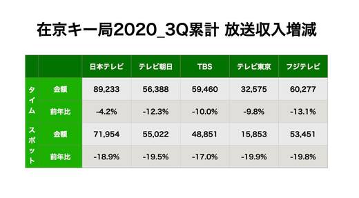 民放キー局の2020年度第3四半期決算が出そろった。各局の業績の中でも、放送事業そのものの収入を取り出して見てみよう。各局のタイム(番組提供CMの収入)とスポット(番組と番組の間に流れるCM)それぞれの数値を表にした。