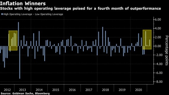 ゴールドマンとブルームバーグがまとめたデータによると、営業レバレッジの高い企業のバスケットは2月初め以降、低いグループのパフォーマンスを1.7ポイント上回った。