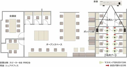 小型スピーカー形状であるため、天井や壁面はもちろん、パーティションなどの什器に設置することもできる。VSP-2は、野村不動産が運営するサテライト型シェアオフィス「H¹T」でも導入されており、低コストで会話漏れを防ぐツールとして注目を集めている。