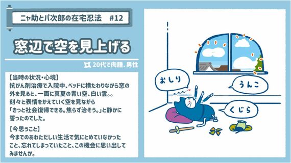 2020年5月19日付読売新聞夕刊(関西版)に掲載された、「自粛生活がん患者の知恵」という見出しの5段記事のこと。3点のイラスト付きだ。
