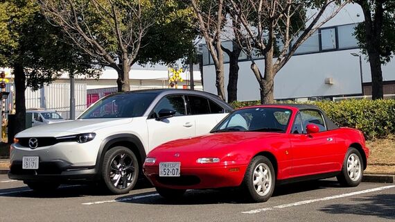 マツダの初代「ロードスター(NA)」と、マツダ初の量産型EV「MX-30 EVモデル」。この2台を、マツダR&Dセンター横浜(横浜市神奈川区)の駐車場で並べてみた。