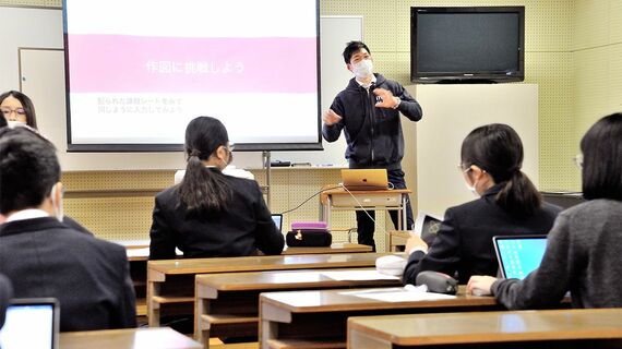 20年度ミクシィは、8つある区立中学校の全校を対象に、独自開発のオリジナルプログラミング教育アプリを使った講座を実施。その中でも、理数教育重点校となっている鉢山中学校(以下、鉢山中)では、3学年それぞれの「総合」の時間を使って全校生徒約100人に全3回の必修授業を行った。講師はミクシィの技術者で、サポートスタッフも指導に入る。