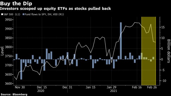 米国債利回りが急上昇し、株式市場全般に下押し圧力がかかった先週、米国の上場投資信託(ETF)には資金が一貫して流入。市場の波乱がピークに達した2月25日には27億ドル(約2900億円)が殺到した。ブルームバーグの集計データによると、2月の合計ではETFへの資金流入は過去12カ月平均の4倍の800億ドルに上った。