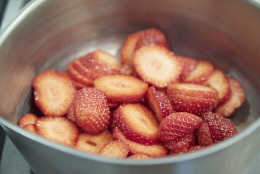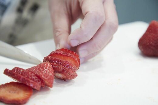 まずはいちごをスライス。タテでもヨコでも結構です。