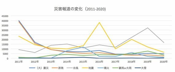 東日本大震災から10年。テレビは災害をどれくらい報じてきたのだろう。図は、2011年3月から2020年12月までの災害報道の変化を時系列で表したものである。