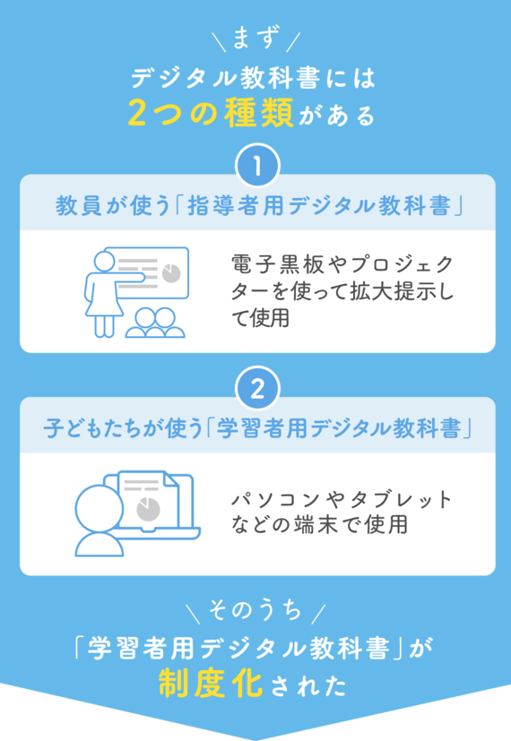 まず、デジタル教科書には2つの種類があります。教員が使う「指導者用デジタル教科書」と、児童・生徒が使う「学習者用デジタル教科書」です。