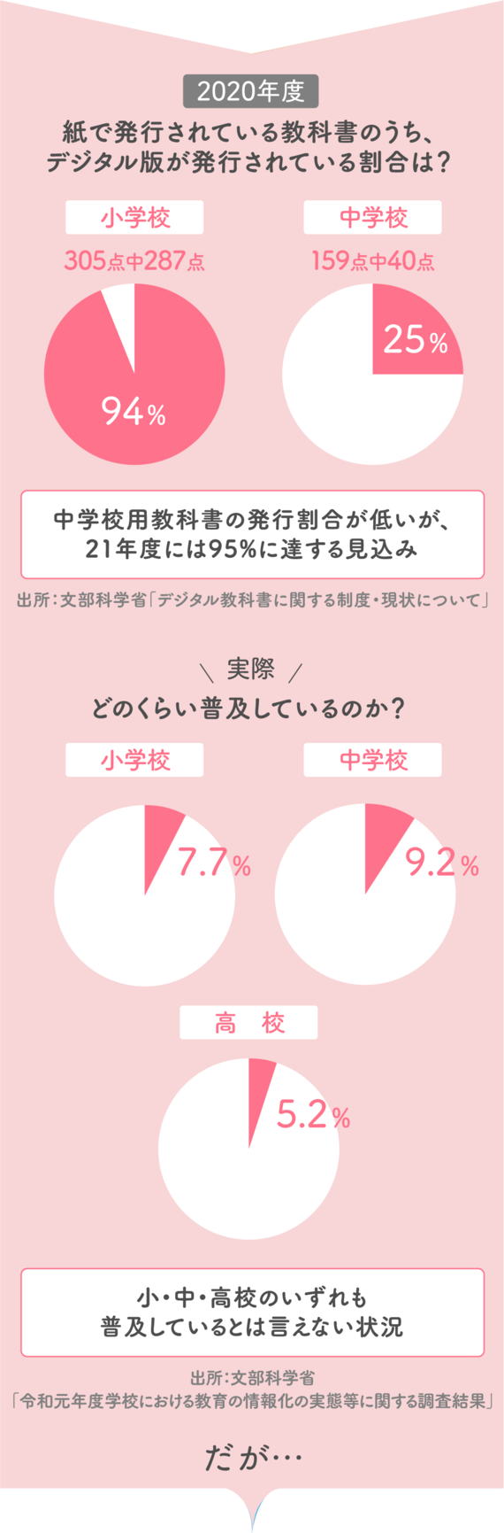 2020年度、紙の教科書のうちデジタル版が発行されている割合は、小学校が94%、中学校で25%でした。中学校の数字が低いですが、21年度には95%に達する見込みです。実際、デジタル教科書自体がどのくらい普及しているかを調べたところ、2020年3月時点では小学校で7.7%、中学校で9.2%、高校で5.2%と、あまり普及していませんでした。