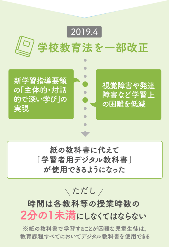2019年には、学校教育法が一部改正されたことにより、「学習者用デジタル教科書」が制度化されました。各教科等の授業時数の2分の1未満にしなくてはならないという制限はあるものの、紙の教科書に代えて「学習者用デジタル教科書」が使用できるようになりました。