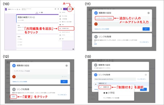 「リンクを知っている全員」にしてしまうと、URLが流出した場合、広まってしまうことが考えられる。そのため、「制限付き」に設定する。教員間で集計結果やテストの共同編集を行いたい場合は、(11)で共同編集者として登録するのが無難だ。