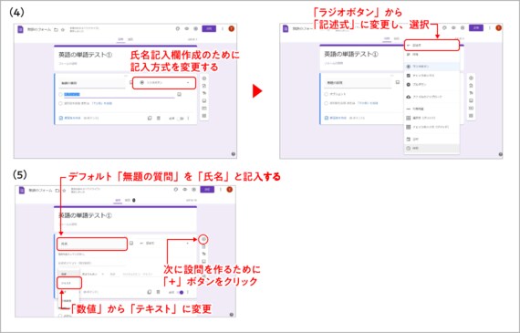 (5) さらに、デフォルトでは「無題の質問」となっている欄をクリックし「氏名」と記入する。またその下にある「数値」の欄をクリックして「テキスト」に変更する。次の設問を設定していくために右端の「+」ボタンをクリックする。