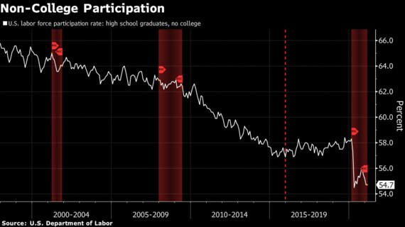 パウエル議長はまた、大学教育を受けていない人々の労働参加率も注視している。パンデミックでこうした層は大きな影響を受けており、5日発表の労働省の統計によると、非大卒者の労働参加率は2月時点でわずか54.7%。20年2月時点では58.3%だった。