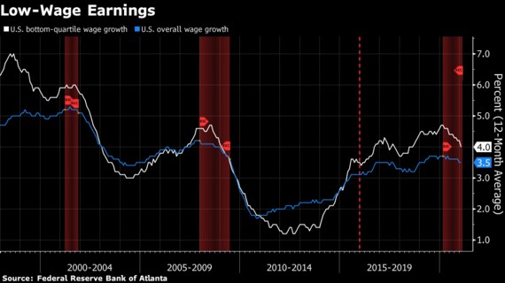 利用可能な直近データである今年1月までには、このグループの賃金上昇率は4%に減速した。2001年と07-09年の不況ではいずれも、このグループの賃金上昇率が底打ちするのに約3年かかった。
