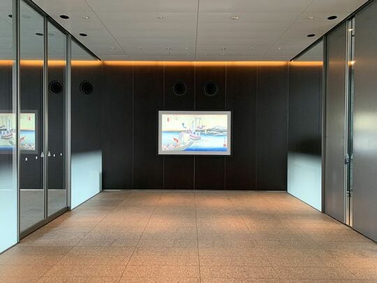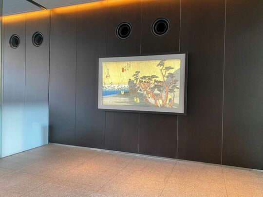 そこでNTT東日本とNTT ArtTechnologyが提案したのが、「オンラインデジタル絵画」の設置だ。5階エントランスに額装した86インチの巨大4Kモニターを2台設置し、高精細にデジタル化した絵画を展示。表示させる絵画を随時変えることで、毎日通勤するオフィスワーカーや秋葉原UDX来訪者の目を楽しませることができる。