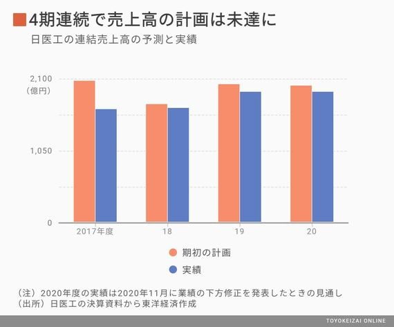 また、日医工は創業家の田村氏が20年間社長を務めるワンマン経営で知られ、「業界の中でも特に売上高へのこだわりが強かった」(同業他社)。ある中堅社員は「田村社長の号令で、期初にストレッチした計画を立てることが多くなっていた」と話す。しかし2017年度以降、期初に掲げた売上高の予想は、4年連続で期中での下方修正を余儀なくされている。