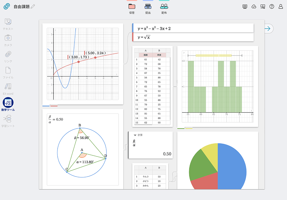 「ClassPad.netを使うと図形やグラフもさっと書くことができますし、授業で先生が図形やグラフを動かしながら説明することも可能です。さらに統計などの授業で扱う数値も、手計算では不可能な大きな数字を扱うことができます。これは紙のノートや黒板にはない、オンライン学習ならではの機能といえるでしょう。