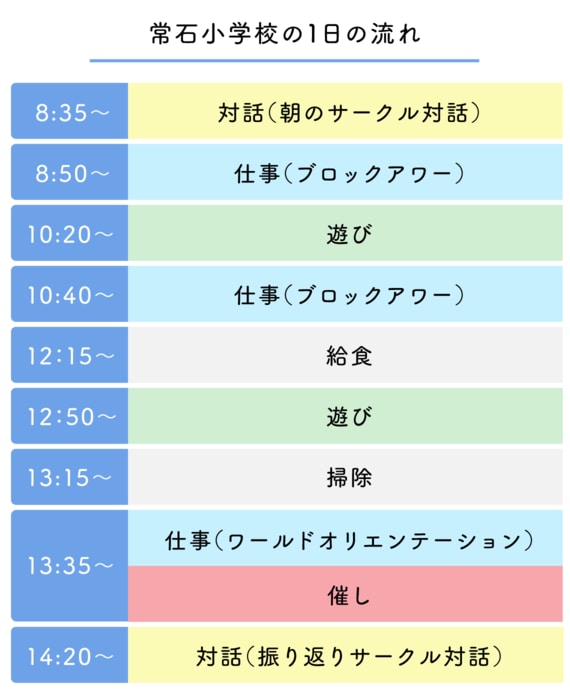 1日の流れを見ていこう。まず朝は、登校すると児童たちは外で遊んだり読書したり、各自思い思いに過ごす。そして、8時35分から「サークル対話」が始まる。