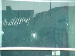 同館は、東本願寺から徒歩で数分の場所にある。実際に行ってみると、入り口付近の窓ガラスに野球ボール大ぐらいの穴が丸く空いていたほか、入り口のガラス戸にも蜘蛛の巣状に亀裂が入っていた。