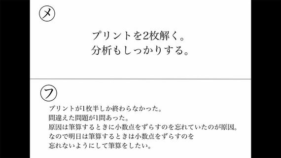 「例えば、『うっかりミスで2問バツだった。次から気をつけたい』という『振り返り』に対しては、『約分を忘れた』『通分で計算間違いがあった』など、『どんなうっかりミスだったのか』をさらに深掘りしてもらいます。これにより、次に同様の問題が出たときの具体的な“戦略”が立てられる。ただ漫然と問題を解いて“量”をこなすのではなく、間違えた問題と深く向き合うことで、学びの“質”を上げることができます」