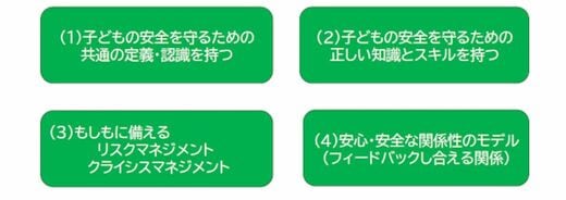 大きく4点を挙げたいと思います。1つめは「子どもの安全を守るための共通の定義・認識を持つこと」。2つめは「子どもの安全を守るための正しい知識とスキルを持つこと」。3つめは「『もしも』に備えること」。4つめは「安心・安全な関係性のモデルを作ること」です。
